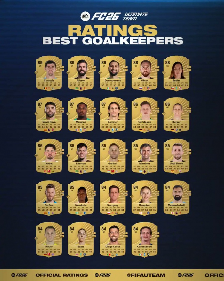 9月3日,FIFAUTeam公布了FC26游戏门将能力值评分,库尔图瓦、阿利森和多纳鲁马以89分并列榜首。